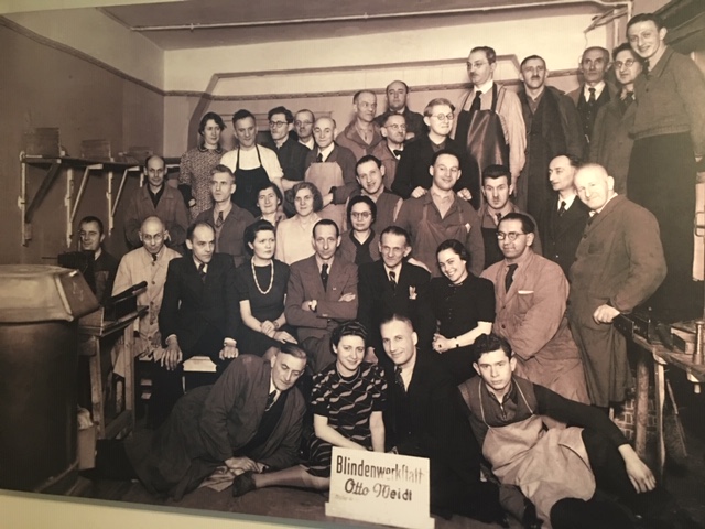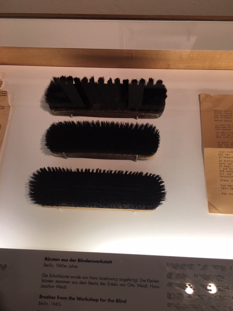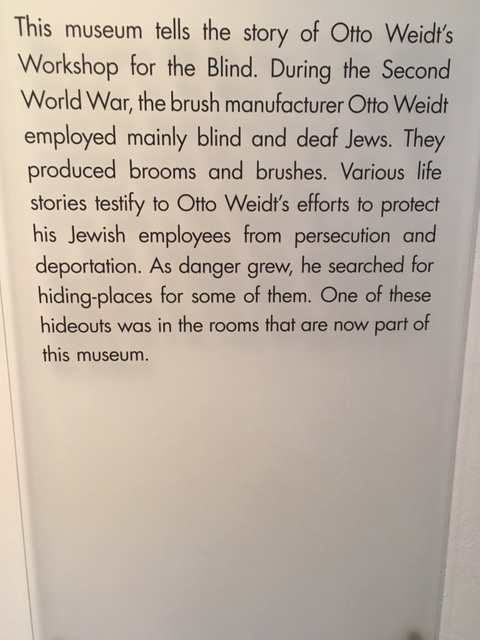 • The young woman in the photo survived the war even though she was sent to Auschwitz. Weidt got special permission ( letter granting permission in exhibit) to go to Auschwitz to see if she was alive. He hid people in various places in the city, with friends, and also at the brush-making factory, which produced brooms, clothes brushes, and shoe brushes for the government.